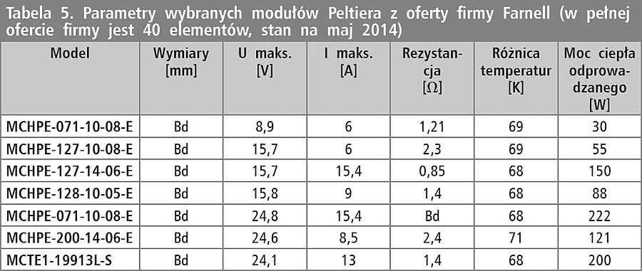Tabela 5. Parametry wybranych modułów Peltiera z oferty firmy Farnell (w pełnej ofercie firmy jest 40 elementów, stan na maj 2014)
