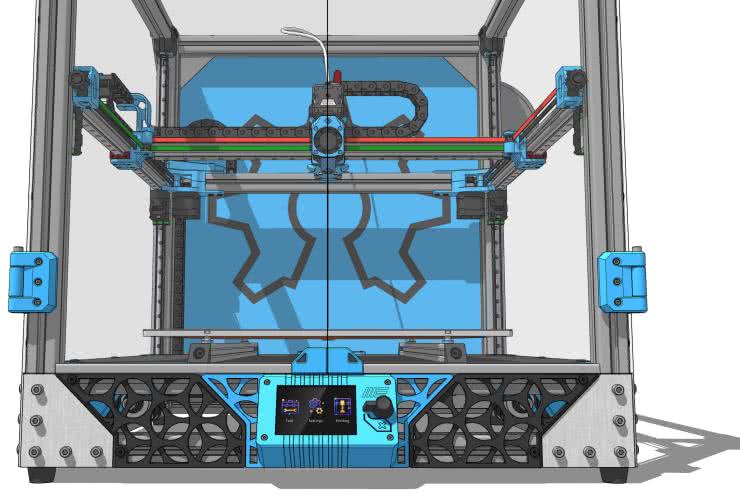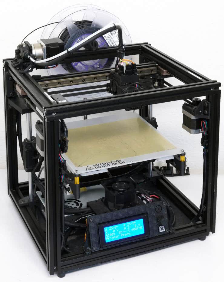 W ostatnich latach coraz częściej spotyka się drukarki „Core XY”: osie X i Y tworzą w nich jeden, wspólny zespół poruszający głowicą. Cała maszyna wyposażona jest w sztywną ramę skrzyniową, do której można przymocować panele obudowy. Istnieją dwa warianty tej konstrukcji: w pierwszym wariancie (fotografia 5) osie X i Y nie przemieszczają się względem reszty maszyny, ale w zamian blat jest ruchomy i w pozycji początkowej znajduje się u góry, by powoli opadać w miarę drukowania kolejnych warstw. W drugim wariancie (fotografia 6) blat pozostaje nieruchomy, a osie X i Y stanowią część ruchomej ramy, która w trakcie drukowania kolejnych warstw jest unoszona w górę. Drukarki Core XY często mają wbudowane dodatkowe funkcjonalności, takie jak autopoziomowanie blatu, ogrzewanie wnętrza obudowy, zintegrowaną kamerę do monitorowania wydruku, oświetlenie czy wreszcie – system zmiany filamentu w trakcie druku.