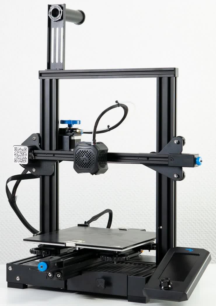 Fotografia 4 ukazuje typową drukarkę 3D o konstrukcji ramowej z ruchomym blatem (tzw. „bed slinger”), w tym przypadku jest to model Ender 3 V2 firmy Creality. Określenie „bed slinger” odnosi się do faktu, iż jedna z osi (w tym wypadku oś Y) przesuwa cały blat wraz z drukowanym przedmiotem. Oś X to pozioma belka, na której znajduje się głowica drukująca. Po lewej stronie belki umocowany jest silnik krokowy napędzający oś X za pomocą paska klinowego, zaś z drugiej strony ramy zamocowany jest ekstruder, obok niego natomiast znajduje się śruba trapezowa osi Z, która podnosi całą oś X. Ekstruder łączy się z głowicą za pomocą dość sztywnej rurki wykonanej z PTFE, nazywanej rurką Bowdena. W tej rurce przemieszcza się filament do głowicy. Ponieważ filament ma średnicę 1,75 mm, a rurka – średnicę wewnętrzną 2 mm, tworzy się pewien „luz”, który ogranicza możliwości druku filamentami elastycznymi, a retrakcja, czyli odległość cofania filamentu, musi być dość duża. Zaletą rozwiązania z rurką Bowdena jest niższa masa głowicy, co pozwala na szybszą jej akcelerację, a tym samym na większą maksymalną prędkość druku. Innym rozwiązaniem byłoby zamontowanie ekstrudera bezpośrednio nad głowicą drukującą, czyli tzw. Direct Drive. Odległość między ekstruderem a blokiem grzewczym, w którym filament jest stapiany, wynosi w takim przypadku 2...4 cm, dzięki czemu retrakcja może być mniejsza, a filamenty elastyczne mają mniejszą „szansę” na nadmierną kompresję w rurce.