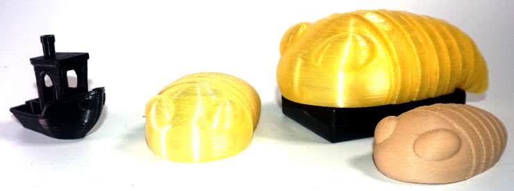 Fotografia 3 pokazuje zaś najpopularniejszy model do testowania jakości druku i filamentu: łódkę 3DBenchy oraz trzy egzemplarze zabawki „Trilobug” w różnych skalach. Te modele też są drukowane w jednym „kawałku”, a zawiasy między segmentami pozostają ukryte. Jeden z „robaków” wykonany został z filamentu PLA udającego kolor i fakturę drewna, choć niezawierającego go wcale (istnieją oczywiście filamenty zawierające kompozytowe drewno w formie drobnych trocin).