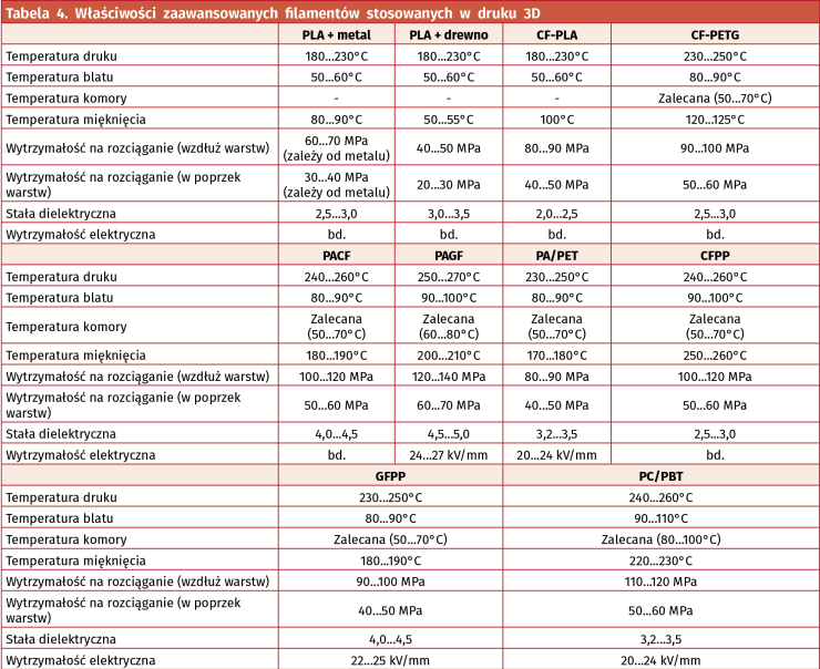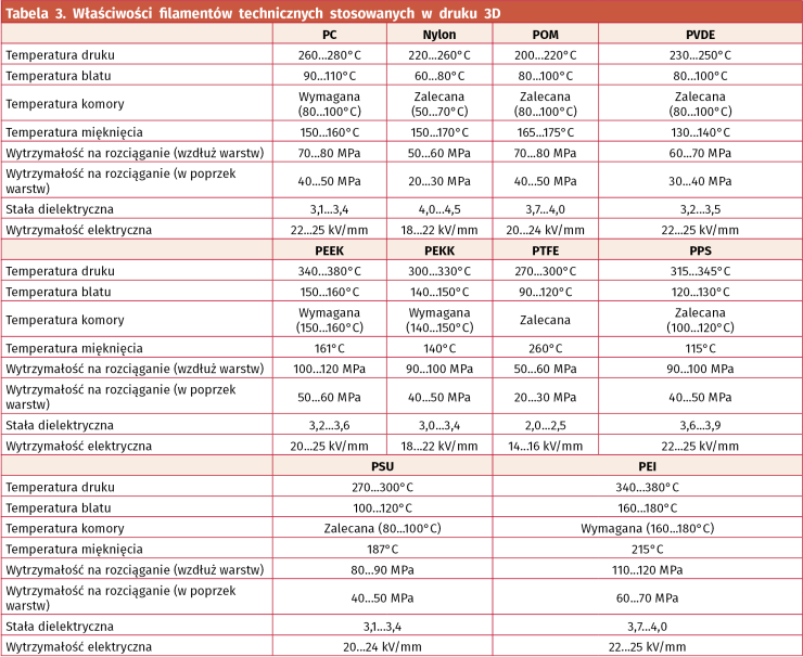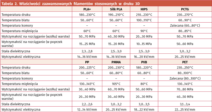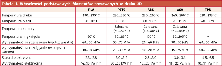 W tabeli 1 zestawiono istotne parametry podstawowych filamentów. Podane wartości są typowe, ale w praktyce filamenty różnych marek i serii mogą mieć inne właściwości – dlatego większość producentów publikuje dokumentację techniczną. Warto nadmienić, że dzieląc wytrzymałość elektryczną przez stałą dielektryczną, a następnie mnożąc przez grubość materiału, można obliczyć maksymalne napięcie przed przebiciem. W celu zachowania marginesu bezpieczeństwa zalecam zakładanie najwyższej stałej i najniższej wytrzymałości – oraz przemnożenie wyniku przez 0,8.