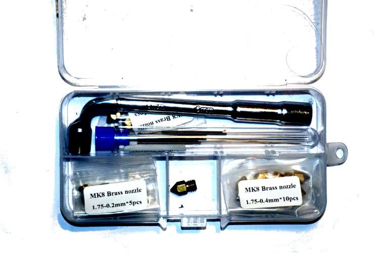Dysze do drukarek 3D są produkowane w kilku popularnych standardach, choć niektórzy producenci wymyślają własne rozwiązania, by przywiązać klientów do swoich produktów. Dysze są wykonywane zazwyczaj z mosiądzu, a średnica otworu wylotowego decyduje w dużej mierze o dokładności detali wydruku, a także o prędkości drukowania. Standardowo stosuje się dyszę 0,4 mm, ale dostępne są warianty od 0,1 mm do 1 mm i większe. Im większa średnica otworu, tym wyższa prędkość pracy ekstrudera, co jest równoznaczne z większą prędkością druku. Jednocześnie jednak potrzebna jest większa moc grzałki, by utrzymać odpowiednią temperaturę bloku grzejnego, oraz lepsze chłodzenie już nałożonej warstwy materiału. Z drugiej strony, dysza 0,1 mm pozwala osiągnąć dużo większą precyzję detali, ale znacząco spowalnia prędkość druku. Niektóre filamenty, zwłaszcza kompozyty, wymagają stosowania specjalizowanych dysz z utwardzonej stali – lub zawierających syntetyczny rubin z otworem odpowiedniej średnicy. Co ciekawe, nawet PLA może wymagać utwardzonej dyszy, jeśli wybrano kolor biały – w tych filamentach barwnikiem jest tlenek tytanu (IV), TiO2. Jego twardość w skali Mohsa wynosi 6, podczas gdy mosiądzu tylko 3,4. Fotografia 3 pokazuje tani zestaw dysz w różnych rozmiarach wraz z kluczem do ich montażu oraz igłami do akupunktury – używanymi do ich przetykania (w fiolce).
