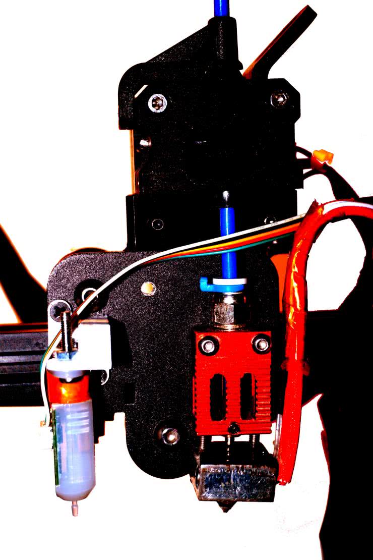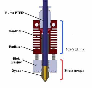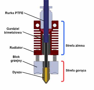 Temperatura maksymalna opisywanej głowicy może wynieść nawet 300°C (w urządzeniach dla hobbystów i większości profesjonalistów). Istnieją rozwiązania z grzałkami dużej mocy oraz chłodzeniem wodnym radiatora, które osiągają temperatury 400...500°C i pozwalają na druk z użyciem bardziej egzotycznych materiałów. Fotografia 2 prezentuje głowicę ze zdjętą osłoną (w której znajdują się: wentylator chłodzący radiator i drugi, chłodzący drukowany fragment modelu), widać też na powierzchni bloku grzejnego ślad wycieku PLA, gdy dysza zatkała się z powodu ustawienia zbyt niskiej temperatury. Z bloku grzejnego zdjęto silikonową „skarpetę” izolacyjną, która stanowi dla niego dodatkowy izolator termiczny. W razie oderwania się wydruku od blatu (co zwykle kończy się oklejeniem głowicy kłębkiem wyekstrudowanego filamentu) owa skarpeta ułatwia oczyszczenie głowicy, jednak łatwo ją przy tym uszkodzić, dlatego zaleca się zaopatrzenie w zapasowy egzemplarz.