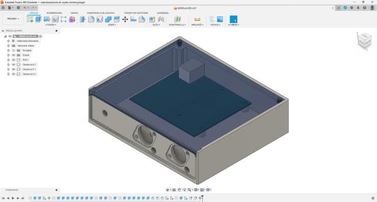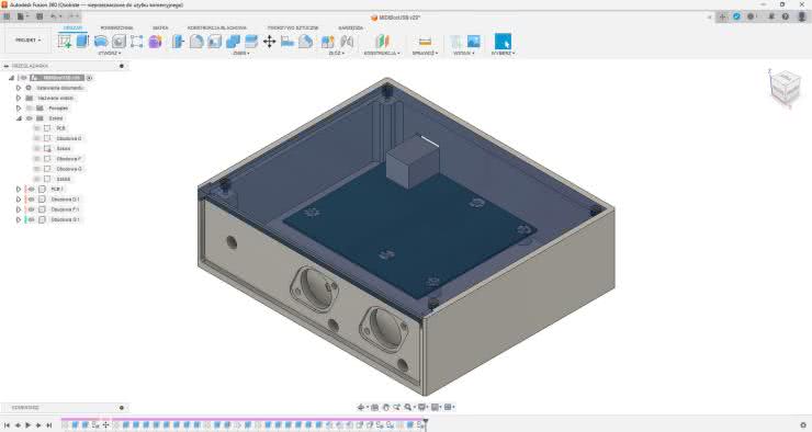 Spróbujmy zatem zaprojektować prostą obudowę w programie Autodesk Fusion 360. Obudowa będzie przeznaczona do płytki interfejsu USB-MIDI (stanowiącego część projektu MIDIBox) i wykonana na drukarce 3D, co narzuca pewne ograniczenia. W obudowie muszą się znaleźć otwory pod gniazda USB i DIN oraz trzy diody LED, a także elementy pozwalające umocować płytkę i zamknąć obudowę. Druk 3D narzuca jednak pewne ograniczenia. Po pierwsze, wytrzymałość w osi Z jest z grubsza dwa razy mniejsza niż w osiach X i Y. Ma to szczególne znaczenie w przypadku rozciągania wzdłuż osi Z oraz występowania sił ścinających prostopadłych do tej osi. Drugim ograniczeniem są wszelkie nawisy i mostki – w większości przypadków brak podpór dodanych w slicerze sprawi, że te elementy wyjdą źle. Dla estetów znaczenie ma też fakt, iż tylko powierzchnia przylegająca do blatu będzie relatywnie ładna. Boki będą miały mniej lub bardziej widoczne linie druku, a i góra także może nie wyglądać najlepiej. Niektóre filamenty są podatne na obróbkę mechaniczną, a inne na wygładzanie oparami acetonu. Najpopularniejszy materiał – PLA – jest pod tymi względami problematyczny.