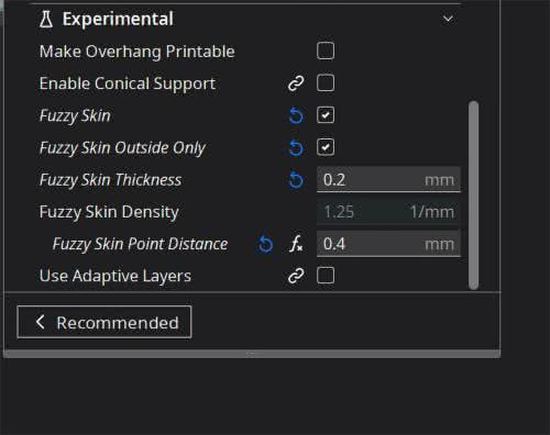 Obudowa będzie wykonana z czarnego PLA. Jako slicera użyjemy Ultimaker Cura. Grubość warstw 0,2 mm, wypełnienie 25%, grubość ścianek 1,8 mm. Ważna uwaga: panel frontowy należy obrócić „frontem” do dołu, górną część zaś trzeba będzie obrócić o 180 stopni. Dla dolnej obudowy wybieramy podpory typu „Tree support” z opcją „Touch bulid plate only”. Wybieramy też w sekcji „Experimental” opcję „Fuzzy skin”, z parametrami jak na rysunku 9. Front i góra powinny być drukowane bez tej opcji i z normalnymi podporami. Co więcej, front może mieć wypełnienie 100%, podczas gdy w przypadku reszty wystarczy 25%.