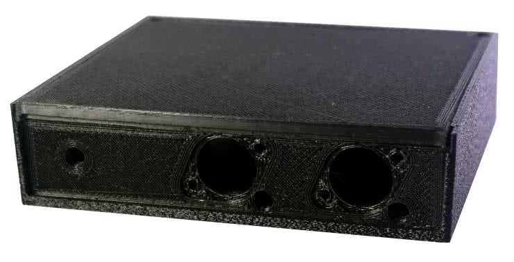 Najlepszym rozwiązaniem byłoby zatem wykonanie każdej ścianki obudowy jako oddzielnego elementu. Jeśli zewnętrzne powierzchnie będą leżeć na blacie drukarki, cała obudowa będzie się dobrze prezentować. Problemem tego rozwiązania jest konieczność opracowania dobrej metody łączenia paneli obudowy w jednolitą całość. Są na to sposoby, jak klipsy, wpusty, klejenie lub montaż na wkręty. Ba, taką obudowę można wręcz „zlutować”, jeśli ktoś ma do tego cierpliwość i zdolności manualne. Drugą opcją jest zaprojektowanie obudowy dwuczęściowej: jedna część łączy podstawę z panelami przednim i tylnym, druga zaś – górę z boczkami. Trzecia możliwość to obudowa, w której przynajmniej jeden panel jest oddzielną częścią, a góra i dół reszty obudowy są rozdzielone na środku. Gotowe obudowy uniwersalne tego typu są bardzo popularne wśród hobbystów. W tym konkretnym wypadku zastosujemy konstrukcję trzyczęściową: panel przedni zostanie wydrukowany oddzielnie (dla większej wytrzymałości), a górna pokrywa będzie wsuwana na miejsce przed skręceniem. Linie warstw zostaną zaś wykorzystane w celach ozdobnych dzięki zastosowaniu jednej z zaawansowanych opcji slicera.