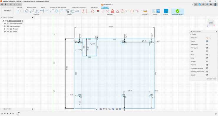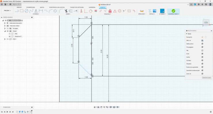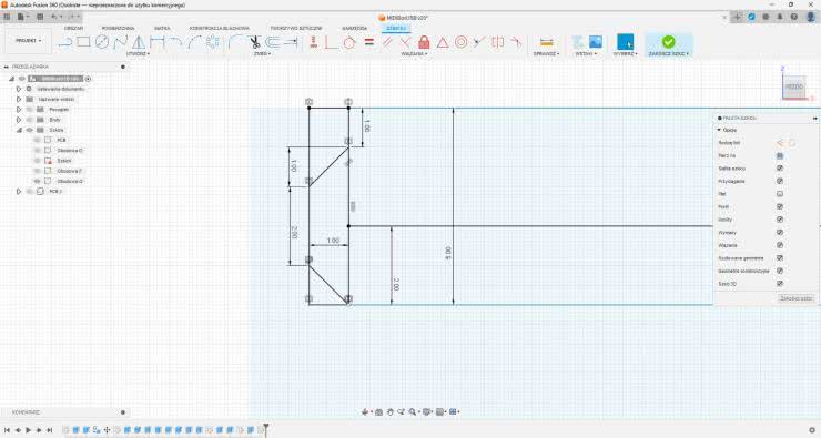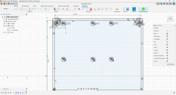 W tym miejscu początkujący użytkownik aplikacji wróciłby do szkicu płytki drukowanej i uzupełniłby go o resztę elementów obudowy. Nie jest to właściwa metoda pracy, gdyż prowadzi do nie tylko niepotrzebnej komplikacji szkicu, ale też utrudnia edytowanie obudowy w przyszłości. Przed rozpoczęciem nowego szkicu należy uczynić poprzedni szkic widocznym, ale ukryć komponent. Nowy szkic powinien być na tej samej płaszczyźnie. Następnie trzeba dodać sześć okręgów, które będą otworami pod wkręty i każdy z nich powiązać z otworem w płytce za pomocą wiązania „współosiowość”. Reszta obudowy składa się z prostokąta o wymiarach 114×97 mm. Następnym krokiem jest użycie odsunięcia [O], odznaczenie wyboru łańcuchowego i wybranie trzech krawędzi prostokąta. Odległość to 3 mm na zewnątrz. Dzięki temu obudowa będzie miała wymiary 120×100 mm. Wewnętrzny prostokąt obudowy został odsunięty na 4 mm od otworu w płytce i o 15 mm od boku gniazda, od lewej strony. Zostawi to dość luzu dla złącza. Następnie należy dodać kolejne koła o średnicy 6 mm, współosiowe z kołami 2,5 mm. To będą kołki nośne płytki. By zamknąć ścianki obudowy, należy użyć narzędzia „rozwijaj”, które wydłuża każdą linię. W górnych narożnikach dodać można dwa kwadraty 6×6 mm, a w każdym z nich wycentrowany otwór 2,5 mm. Elementy te zostały zaokrąglone, co je nieco wzmacnia, ale też pomaga w procesie drukowana. Ostatnim elementem do wykonania jest front. Najpierw rysujemy prostokąt bez wymiarów. Grubość jest następnie zdefiniowana na 4 mm, a odległość jego górnej krawędzi od dolnej krawędzi obudowy to 6 mm. Z jednej strony prostokąta dodane są trzy linie tworzące trapez. Istotne jest, by kąt boków trapezu względem bocznej krawędzi tego prostokąta wynosił maksymalnie 45° – gdy front będzie drukowany, te krawędzie będą „wisieć” w powietrzu nad blatem. Maksymalny kąt tego nawisu wynosi zazwyczaj właśnie 45° w przypadku wielu starszych modeli drukarek 3D, ale w nowszych maszynach, dobrze skalibrowanych dla danego filamentu, może wynieść nawet 55°. Na środku prostokąta dodana jest linia pionowa, przy czym należy wybrać punkt oznaczony trójkątem środka linii poziomej. Linia ta zmieniana jest na linię konstrukcyjną [X], a następnie należy użyć narzędzia „odbicie”, z tą linią w roli osi odbicia, co spowoduje odbicie lustrzane trapezu. Wiązanie współliniowości pozwoli nam umieścić boczną krawędź prostokąta obudowy równo z wewnętrzną ścianką obudowy, dzięki czemu potem trapezy staną się wcięciami w ściankach. Poziomą część prostokąta należy powiązać równością z szerokością wnętrza obudowy.
