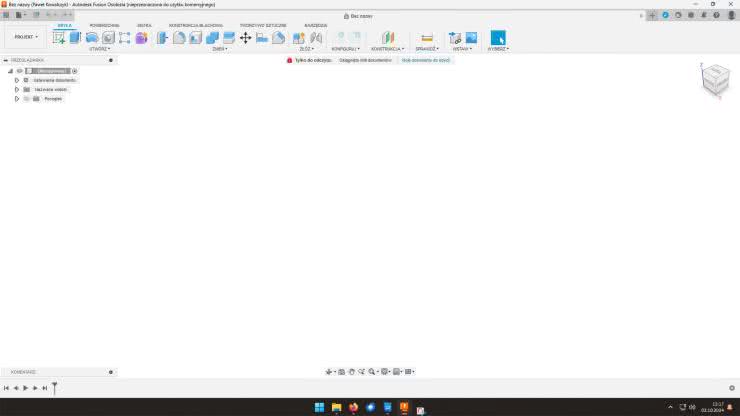Proces rejestracji i instalacji programu Autodesk Fusion 360 nie będzie omawiany. Zamiast tego położony zostanie nacisk na zapoznanie się z interfejsem użytkownika i zasadami projektowania parametrycznego. Rysunek 1 pokazuje główne okno programu. Górną część okna zajmuje paleta narzędzi, podzielona na zakładki. Po lewej stronie można wybrać, jakim aspektem projektu się zajmujemy. Domyślnie wybrana jest paleta projektowania. Poniżej tego menu znajduje się przeglądarka elementów projektu: szkiców, brył i części. Prawy górny róg okna głównego zajmuje kostka, która pozwala manipulować widokiem 3D i wrócić do widoku domyślnego. Na samym dole okna znajduje się zaś „linia czasu” pozwalająca na przeglądanie kolejnych operacji i edytowanie ich. Na zrzucie ekranu widać też ostrzeżenie o osiągnięciu limitu dokumentów. Z pozostałymi elementami interfejsu będziemy się zapoznawać w miarę potrzeb.