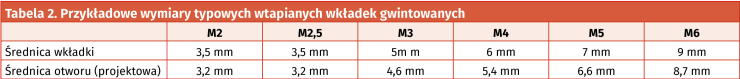 Najlepsze rozwiązanie stanowi zastosowanie wtapianych wkładek gwintowanych. Te drobne elementy wykonane z mosiądzu mają wewnątrz gwint metryczny, a na zewnątrz są uformowane tak, by tworzyć dużą powierzchnię styku z tworzywem, a przy tym nie dać się łatwo wyrwać lub wykręcić. Instalacja insertów podnosi koszty produkcji, dlatego stosuje się ją głównie w produktach komercyjnych wyższej jakości (lepszych obudowach uniwersalnych, laptopach itp.). W przypadku małych serii i pojedynczych sztuk wykonywanych metodą druku 3D wkładki takie mają znacznie większy sens ekonomiczny – szczególnie hobbyści umiłowali sobie to rozwiązanie w ostatnich latach, a na rynku dostępne są prasy z elementem grzejnym do ich instalowania. Jednakże takie wkładki można z powodzeniem zamontować także za pomocą zwykłej kolby lutowniczej. Należy zaprojektować otwór pod wkładkę wedle specyfikacji producenta. Tabela 2 pokazuje przykładowe zalecenia.