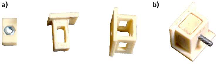 Kolejna metoda łączy elementy metody pierwszej i drugiej oraz wymaga dwóch elementów. Pierwszym z nich jest prosty kształt: kwadrat lub prostokąt z otworem na nakrętkę. Może mieć on grubość nakrętki lub być nieco grubszy, jak w metodzie pierwszej. Właściwa część obudowy ma otwór dopasowany wielkością do „wkładki” z nakrętką. Przykładowy model i jego przekrój pokazują rysunki 5a i 5b, zaś fotografia 4 prezentuje gotowy komplet elementów.