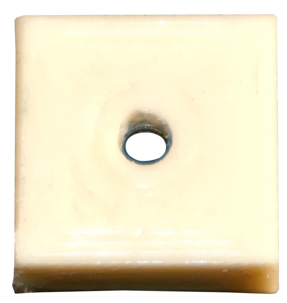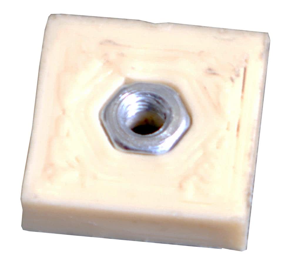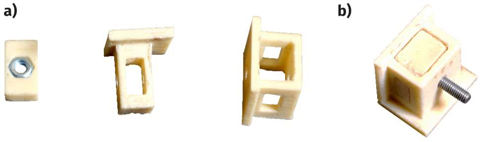 Rysunek 1b pokazuje wynikową bryłę, a fotografia 1 – gotowy element z nakrętką. Rozwiązanie to jest łatwe w implementacji, a wytrzymałość na wyrwanie nakrętki zależy od liczby warstw górnych i dolnych, gdyż to one przenoszą naprężenia. Grubość ścianek też ma znaczenie dla wytrzymałości całego elementu, a typ i gęstość wypełnienia określają sztywność i zdolność przenoszenia naprężeń między warstwami. Wadą tego rozwiązania jest fakt, iż nic (poza tarciem o ścianki boczne wgłębienia) nie trzyma nakrętki na miejscu, przez co nakrętka będzie wypadać, jeśli element zostanie wydrukowany ze zbyt dużą tolerancją. Z kolei zbyt mały luz montażowy może utrudnić wciśnięcie nakrętki na miejsce.