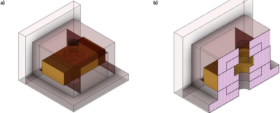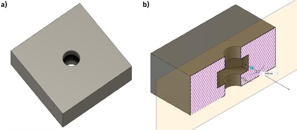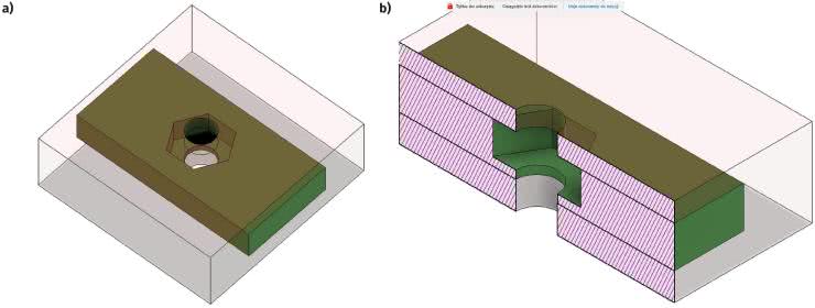 Rysunek 2b pokazuje gotowy element, a rysunek 2c jego przekrój uzyskany za pomocą narzędzia „Analiza przekroju” z sekcji „Sprawdź”. Jak wspomniano, to rozwiązanie ukrywa nakrętkę wewnątrz elementu, ale dzięki dodaniu kanałów nakrętka ta może zostać wyjęta lub wymieniona. Większa liczba połączeń poziomych warstw z zewnętrznymi krawędziami elementu ułatwia przenoszenie naprężeń. Jedyną wadą tego rozwiązania jest pogorszona estetyka. Fotografia 2 prezentuje gotowy element z nakrętką.
