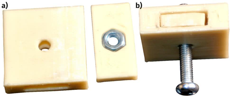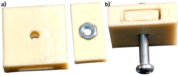 Elementy są trzymane razem za pomocą wkładki z nakrętką. W tym przykładzie zastosowałem wkładkę z nakrętką wsuwaną, pokazaną już wcześniej. Element ten jest umieszczany w specjalnie przygotowanym otworze w obu elementach tak, by te nie mogły się przemieścić względem siebie. Wkręt blokuje położenie wkładki. Wytrzymałość połączenia zależy od wytrzymałości mechanicznej wydrukowanych elementów. Warto też pamiętać, że pokazane rozwiązania mogą wymagać dodatkowej obróbki mechanicznej lub/i uwzględnienia tolerancji w projekcie – inaczej elementy mogą do siebie zwyczajnie nie pasować. Ostatnie dwa przykłady pokazane na fotografiach wymagały dodatkowego szlifowania pilnikiem.
