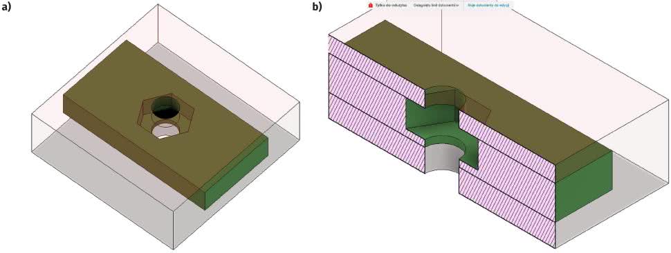 Trzecie rozwiązanie, tym razem z ukrytą nakrętką, wykonuje się analogicznie do rozwiązania drugiego, ale bez kanałów. Rysunek 3a pokazuje taki element, a rysunek 3b jego przekrój.