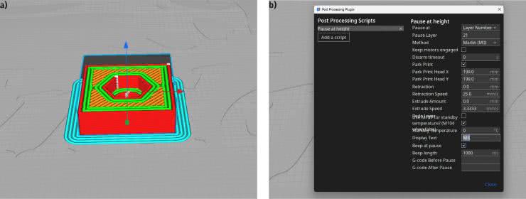 Ponieważ między warstwami wydrukowanej części mamy mniejszą wytrzymałość, taka wkładka – wydrukowana płasko na blacie – może zwiększyć wytrzymałość obudowy, zwłaszcza jeśli będzie przebiegać przez niemal całą jej wysokość. Nie ma też potrzeby, by wkładka była wciskana w otwór – zamiast tego można zaprojektować płytkie zagłębienie na nią, w które zostanie ona wklejona. Technikę tę można też uzupełnić o metodę opisaną wyżej i ukryć wkładki w ściankach obudowy, pauzując drukarkę przed nałożeniem górnych, litych warstw. Nic też nie stoi na przeszkodzie, by wkładki były metalowe, w formie płytek, prętów czy choćby mosiężnych, gwintowanych kołków dystansowych, stosowanych do montażu płytek drukowanych w pewnej odległości od obudowy lub do montażu jednej płytki nad drugą.