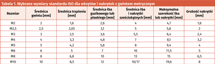 Ważną zaletą masowej produkcji jest standaryzacja wymiarów bardzo wielu komponentów. Elektronik zdaje sobie z tego sprawę na przykładzie standardowych obudów komponentów, ale standaryzacja obejmuje też wiele innych części, od wkrętów, podkładek i nakrętek, przez łożyska, silniki elektryczne, koła zębate i przekładnie, aż po wtyki, gniazda, a nawet magnesy. Dzięki temu projektant nie musi się zastanawiać, skąd weźmie pasujący komponent, a producent może mieć listę kilku czy kilkunastu dostawców potrzebnych części. W naszym konkretnym przypadku skupimy się na typowych gwintach metrycznych, czyli standardzie ISO obowiązującym od 1947 roku. Elementy te oznaczane są literą M, po której podana jest średnica gwintu i są to najbardziej powszechne na świecie elementy łączące ogólnego przeznaczenia. Tabela 1 zestawia istotne dla nas wymiary śrub i nakrętek w rozmiarach najczęściej spotykanych w druku 3D.