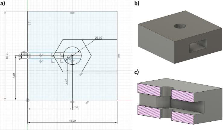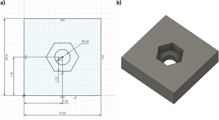 Najprostsze rozwiązanie to zaprojektowanie wgłębienia na nakrętkę. Na rysunku 1a pokazano prosty szkic. Kwadratowy element o wymiarach 15×15 mm zawiera otwór 3 mm pod wkręt M3. Za pomocą narzędzia „Wielokąt opisany” dodano również wyśrodkowany sześciokąt, którego promień został wpisany jako 5,5/2 mm. By jego orientacja była poprawna, jeden z boków został ograniczony wiązaniem „Równoległy” względem jednego z boków kwadratu. W kolejnych krokach wyciągnięto zewnętrzną część kształtu na 4 mm, a potem wewnętrzną na 4–2,4 mm=1,6 mm, czyli na tyle, by nakrętka licowała z górną z powierzchnią.