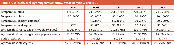 W części drugiej tego cyklu omówione zostały parametry najróżniejszych filamentów. Przypomnijmy sobie kilka z nich za pomocą tabeli 1. Wybrano do niej materiały potencjalnie najlepiej nadające się do wykonywania obudów, ale przy założeniu, że chcemy mieć możliwość druku na każdej, nawet relatywnie taniej drukarce 3D. Obudowa powinna być wytrzymała zarówno mechanicznie, jak i termicznie. Już na początku widać, że nie są to cechy najpopularniejszego materiału „drukarskiego”, czyli PLA. Szczególnie wytrzymałość w poprzek warstw jest dość niska, a to implikuje też niską wytrzymałość na siły ścinające. Jeśli wydrukujemy wewnątrz obudowy elementy montażowe do radiatora lub innego, cięższego elementu, to mogą one z łatwością się oderwać przy uderzeniu z boku. Wytrzymałość termiczna też jest na tyle mała, że obudowa zdeformuje się od stania na blacie, w snopie światła słonecznego w ciepły dzień. Ponadto PLA pod długotrwałym obciążeniem powoli się deformuje.
