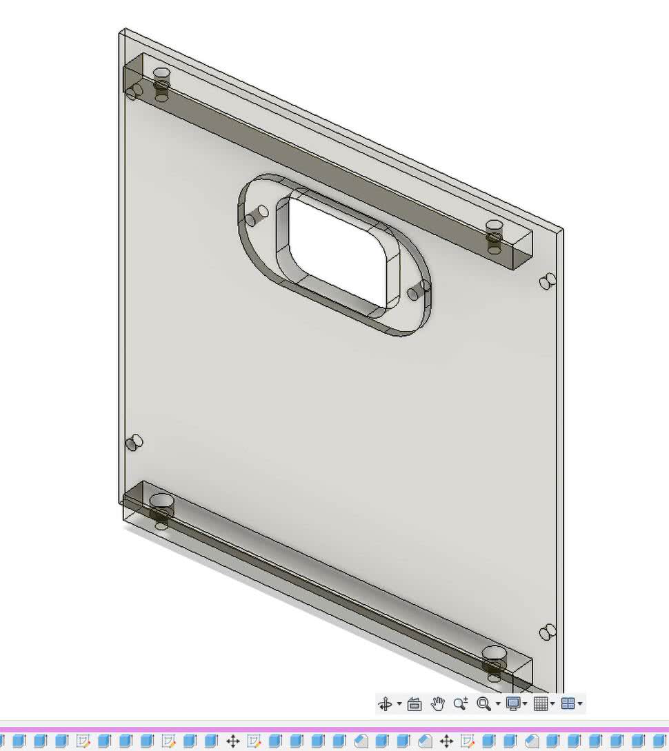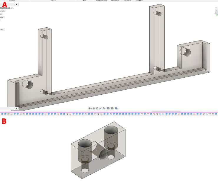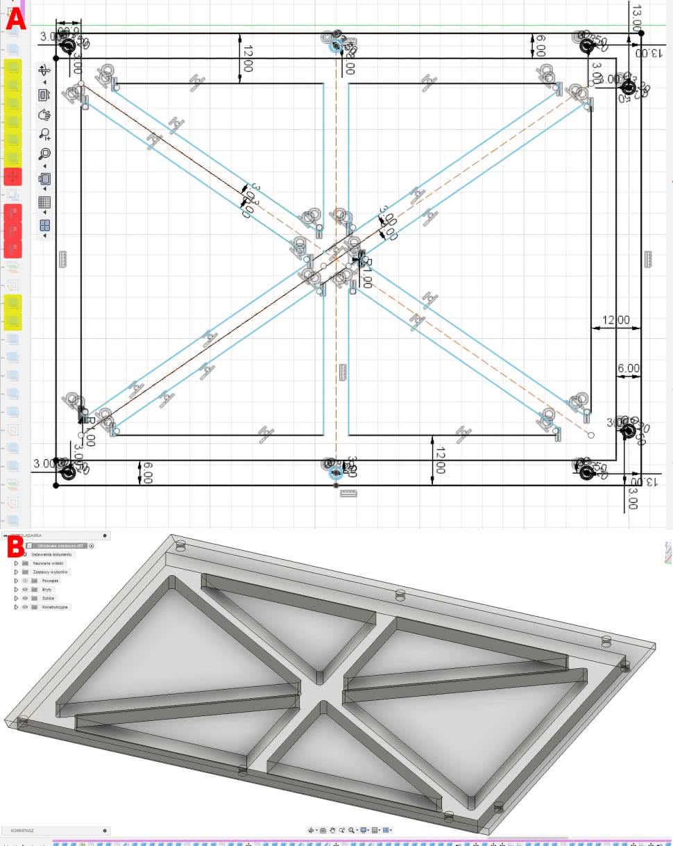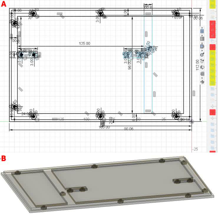 Dolny panel funkcjonuje jako główny element nośny ciężaru całego urządzenia. Do niego właśnie przymocowane zostaną panele boczne i tylny, a także radiator o wymiarach 125×72×35 mm oraz elementy związane z aktywnym chłodzeniem. Dlatego już na tym etapie należy uwzględnić montaż tych elementów. Panel będzie miał grubość 2 mm ze wzmocnieniami o grubości 4 mm, pod nimi właśnie ukryte będą nakrętki M2,5. W trakcie procesu drukowania należy pamiętać o wstrzymaniu druku na czas montażu tych nakrętek. Rysunek 2a pokazuje plan panelu, a rysunek 2b – gotowy element.