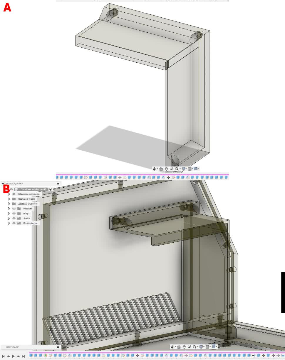 Model bryły urządzenia z podziałem na panele oraz elementy wewnętrznej konstrukcji