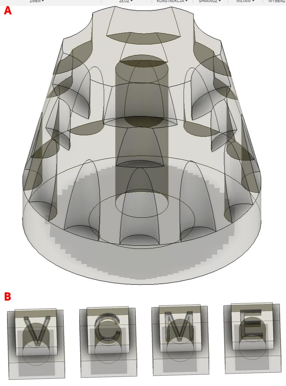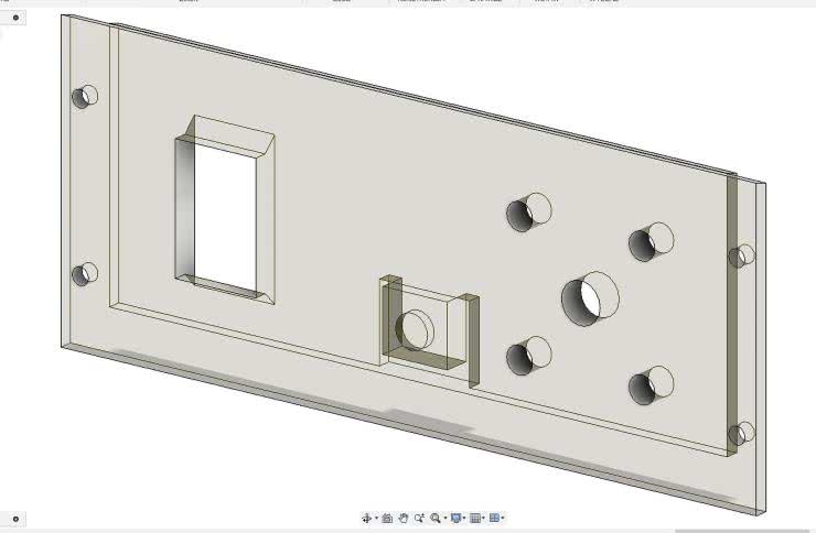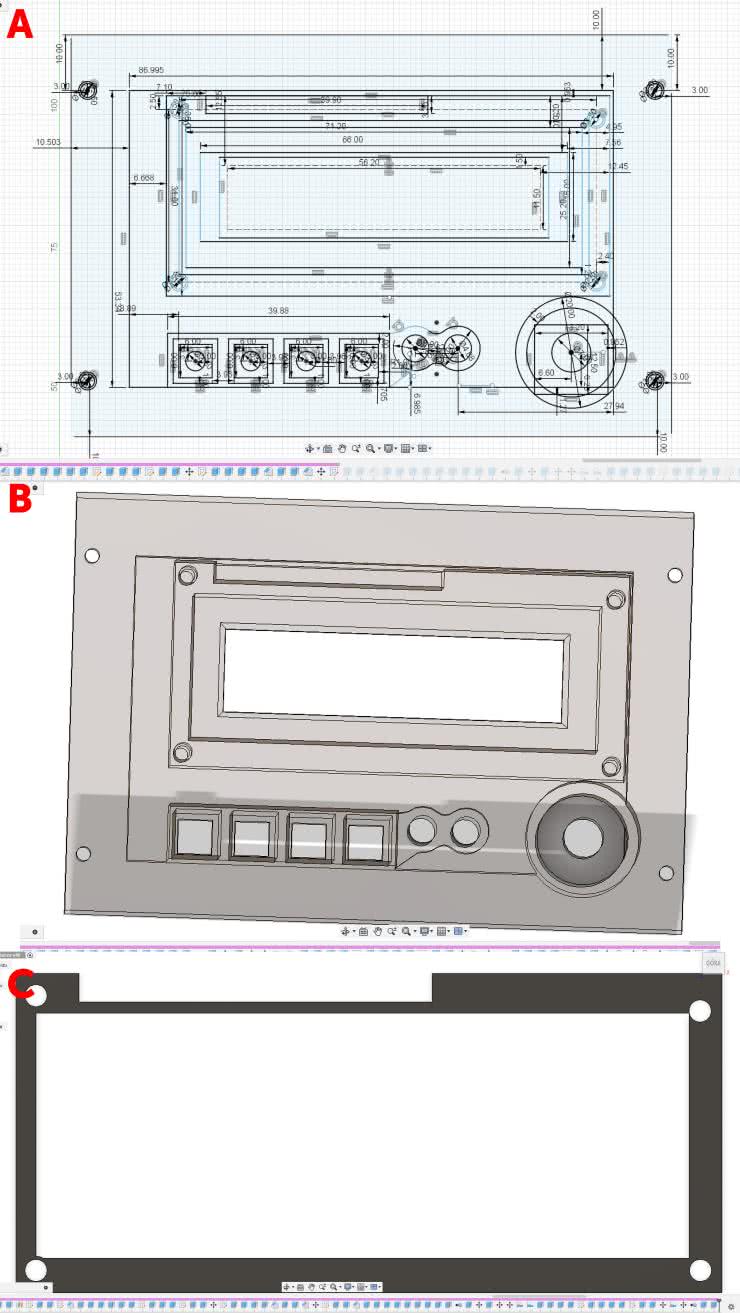 Wokół diod LED również dodano wzmocnienie o wysokości 5 mm, przez co diody będą tylko nieznacznie wystawać nad powierzchnię panelu. Same otwory są nieco mniejszej średnicy, by diody nie miały nadmiernych luzów montażowych. Wokół otworów na przyciski znajdują się kolejne wzmocnienia, ale ich głównym przeznaczeniem jest stabilizacja klawiszy, które będą nałożone na mikroprzełączniki. Dla enkodera dołożono „niszę”, by móc go przykręcić do panelu, a – co za tym idzie – dodatkowo wzmocnić całość. Na bazie tego samego szkicu wykonano również element dystansowy do umieszczenia między wyświetlaczem a właściwą płytką drukowaną sterownika.