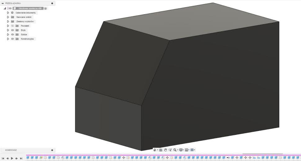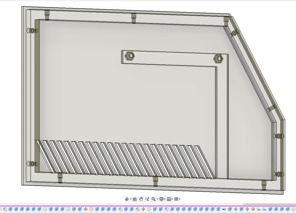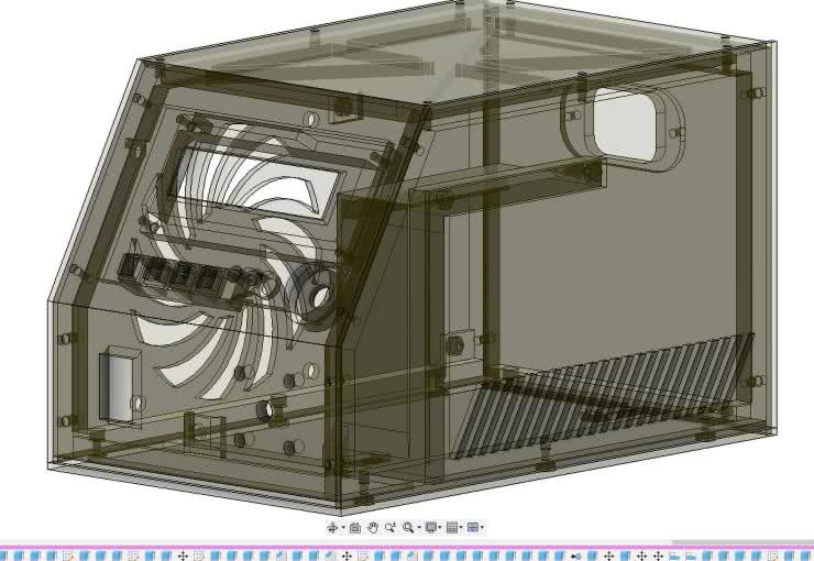 Panel prawy (rysunek 5) został utworzony za pomocą płaszczyzny konstrukcyjnej, odnoszącej się do boku panelu dolnego. W dolnej części ma on otwory wlotowe, nachylone pod kątem 60°, co odpowiada nachyleniu panelu kontrolnego. Tutaj też znajdują się dodatkowe wzmocnienia i kolejne zatopione nakrętki M2,5 – tym razem do zamocowania elementu wzmacniającego konstrukcję, który ogranicza przy okazji kierunek przepływu powietrza i przytrzymuje radiator od góry. Oba panele mają wtopione wkładki gwintowane, do których przykręcone będą: panel przedni, kontrolny i górny. Dzięki temu serwisowanie urządzenia i wymiana najbardziej narażonych na uszkodzenia paneli będzie prosta. Ze względu na duże rozmiary komponentów i niewielką objętość obudowy, upakowanie wszystkiego wymagało pewnej dozy wyobraźni. Elementy, zwłaszcza te znajdujące się na lewym panelu bocznym, są spasowane na styk, a wentylator może potrzebować dodatkowego zaokrąglenia jednego z narożników. Pewną pomocą byłaby wizualizacja wszystkich komponentów, ale nie jest to konieczność – tak długo, jak pamiętamy o krytycznych wymiarach. Dla drobnego ułatwienia szkice paneli zawierają też linie konstrukcyjne wizualizujące sam radiator.