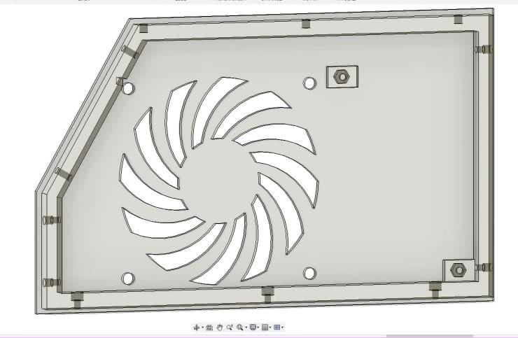 Dwa panele boczne są częściowymi odbiciami lustrzanymi – zachowują ten sam kształt i wzmocnienia, ale panel lewy (rysunek 4) ma miejsce na wentylator 80×80 mm oraz zasilacz modułowy 12 V/3 A. Na etapie prototypowania zadbano też o ładne i estetyczne wykonanie kratki wentylacyjnej – forma otworów podąża za kierunkiem obrotów wentylatora i profilem łopatek.