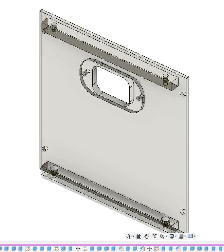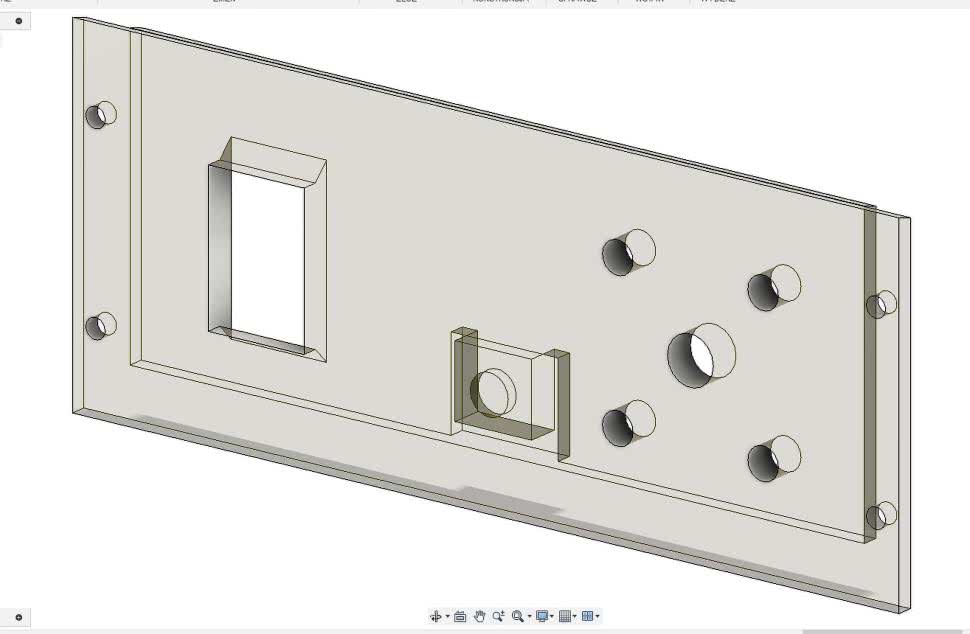 Jak wspomniano wcześniej, panele te są „wyciągnięte” ze szkicu panelu lewego. Panel przedni ma wbudowany włącznik zasilania, przełącznik gniazd oraz cztery gniazda bananowe o rozstawie 19×19 mm. Wyznaczono też otwór pod gniazdo TRS 3,5 mm, ale jest on zaślepiony cienką warstwą plastiku, gdyż stanowi opcjonalne wyprowadzenie portu UART. Panel ma dodatkowe wzmocnienia usztywniające, zwłaszcza w okolicach gniazd bananowych – model gotowego elementu pokazano na rysunku 9.